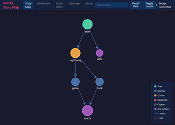 - Story Map — Interactive graph of all labels and connections. Color-coded by type. Click any node to warp the running game to that scene with correct visual state (backgrounds, sprites, music).